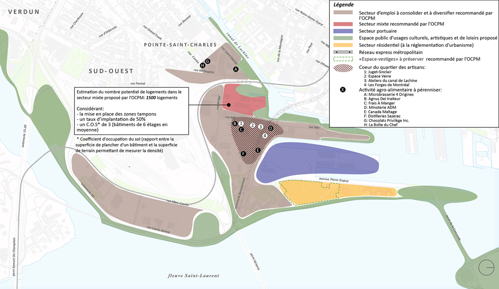 • En explorant la possibilité d’introduire de l’habitation dans une partie du sous-secteur (voir carte des activités urbaines recommandées par l’Office de consultation publique de Montréal) comme fonction complémentaire, tout en maintenant la dominance du secteur d’emploi, si les conditions requises pour assurer un milieu de vie complet et de qualité sont réunies :